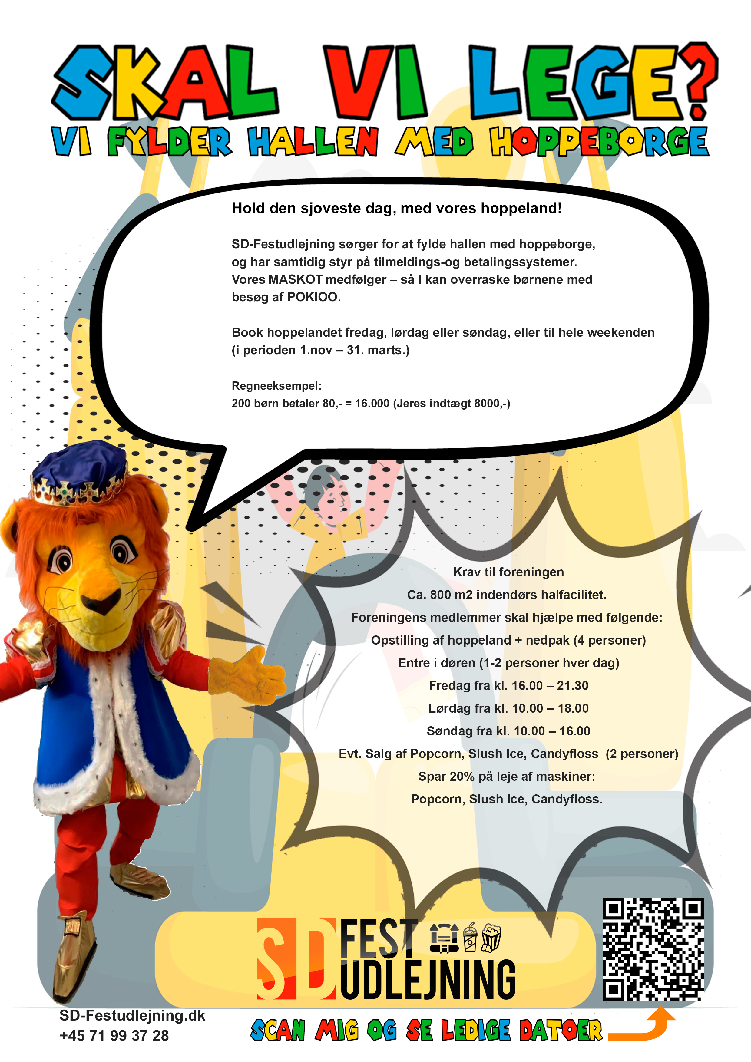 SD-Festudlejning sørger for at fylde hallen med hoppeborge, og har samtidig styr på tilmeldings-og betalingssystemer. Vores MASKOT medfølger – så I kan overraske børnene med besøg af POKIOO.